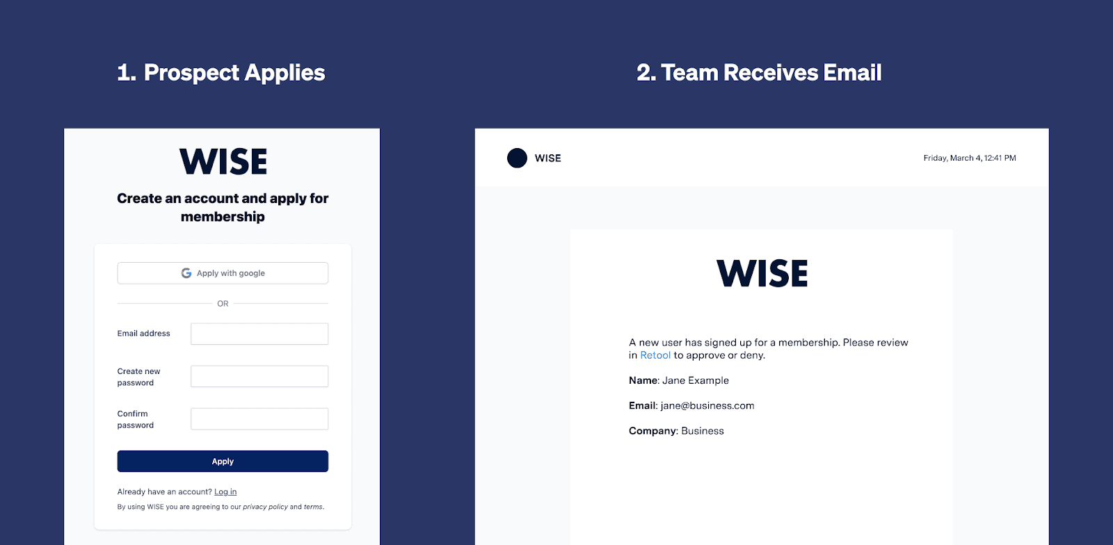 In just a few clicks, she is able to review each applicant—when they applied, what company they work for—and either accept or deny their application. Once a new member is accepted, an email is automatically triggered via Customer.io that helps the new member complete their onboarding in the WISE portal.