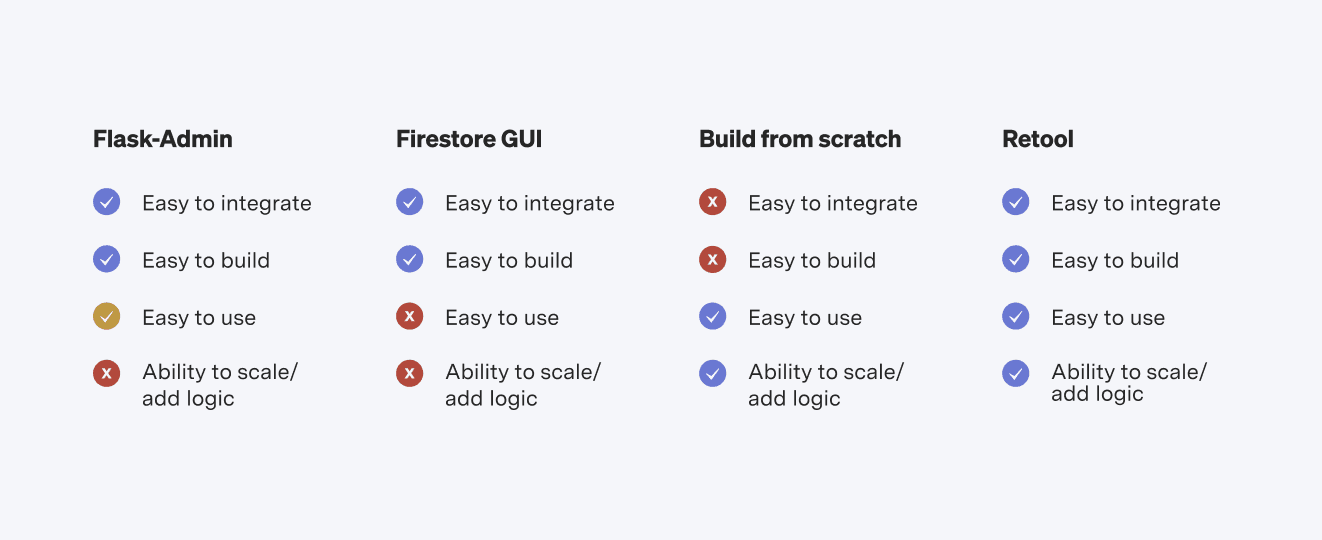 After learning more about Retool, the team decided that it was the right choice for this project. Retool had a native integration to Firestore, made building apps easy, created a user-friendly interface for Cassie, and could be customized like a homegrown app. Says Dan: